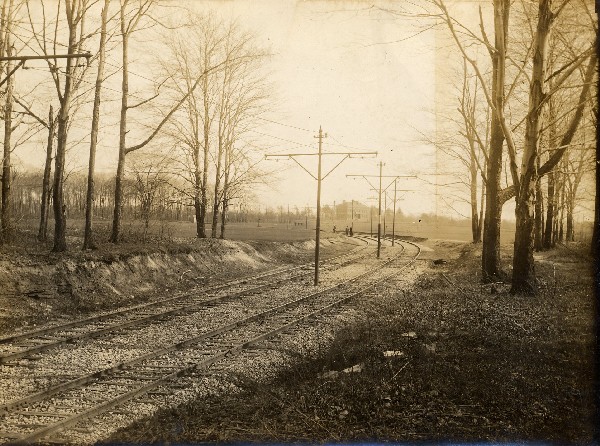 | This picture, dated April, 1913, shows the trolley tracks along what